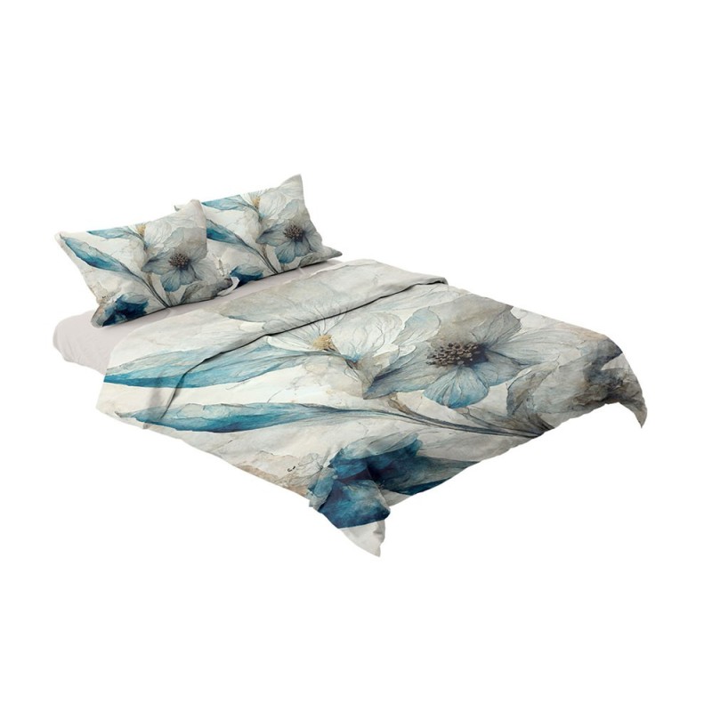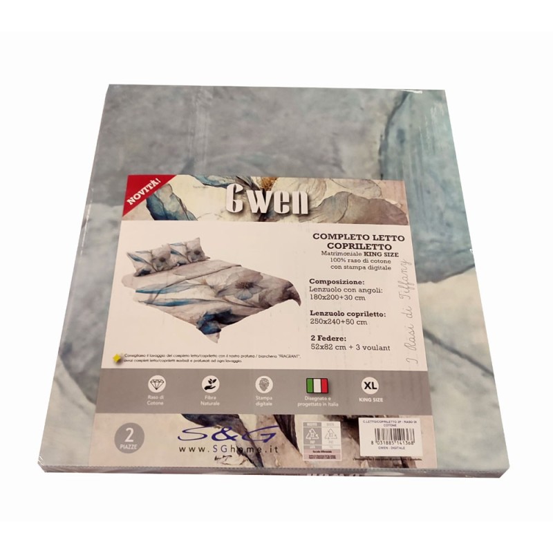 Completo lenzuola copriletto matrimoniale disegno Gwen da SGhome, ottima azienda di biancheria per la casa. 100% raso di cotone, stampa digitale anche sulla parte posteriore della balza in modo da poterlo usare anche come copriletto nei mesi più caldi, alta qualità.