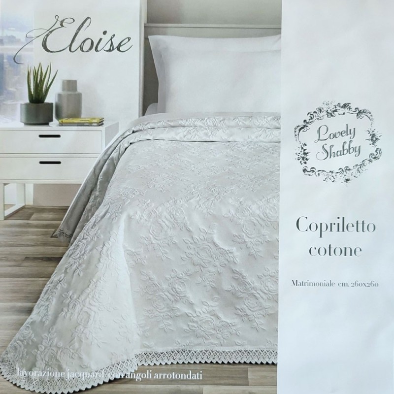 Copriletto Eloise Lovely shabby da Gitiesse, ottima azienda di biancheria per la casa. Tessuto cotone lavorazione Jacquard con applicazioni in pizzo, misura letto matrimoniale / due piazze. Prodotto di ottima qualità.