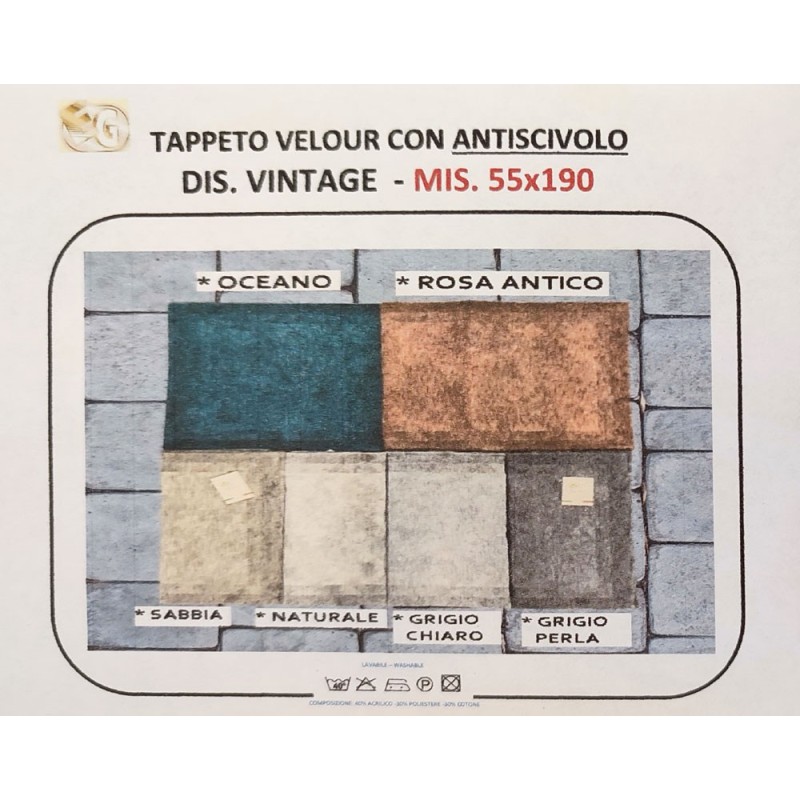 Tappeto velour modello Vintage da EG, ottima azienda Made in Italy nelle produzione di biancheria per la casa. Sottofondo antiscivolo e facilmente lavabile. Proposto in diverse misure e colori.