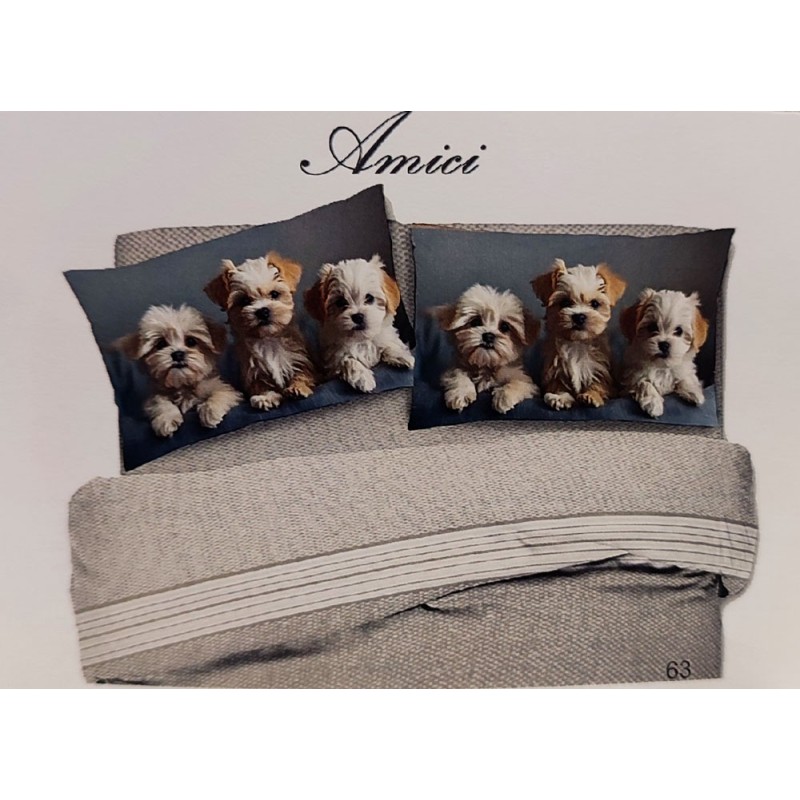 Completo lenzuola 100% cotone disegno Cani Amici 63 da Manifattura Imberti, ottima azienda di biancheria per la casa Made in Italy. Stampe digitali a alta risoluzione, un prodotto di alta qualità. Disponibile nella misura letto singolo / una piazza, piazza e mezza e matrimoniale / due piazze.