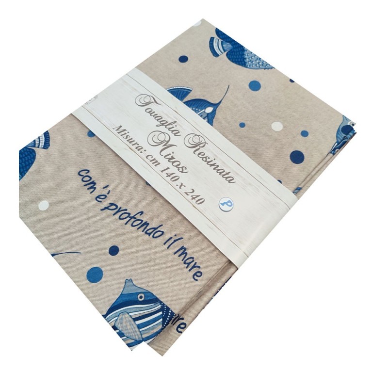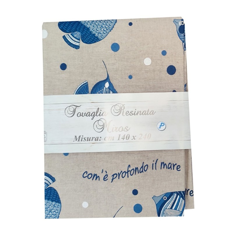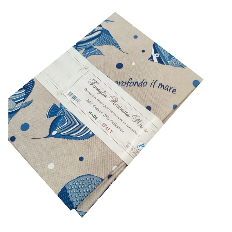 Tovaglia resinata disegno Mare blu Miros da Pezzoli, ottima azienda di biancheria per la casa made in Italy. Tessuto 80% cotone 20% poliestere, la particolare lavorazione resinata la rende antimacchia, molto spessa e resistente ai lavaggi con tinte durature, bellissima anche come copritavolo. Rifinita con orlino, fondo greggio, lavabile in lavatrice a 40°.