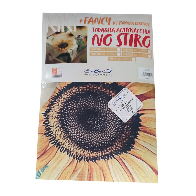 Tovaglia antimacchia disegno Kiki Fancy Girasoli da Sghome, ottima azienda di biancheria per la casa. Tessuto 100% poliestere effetto lino, si pulisce facilmente con una spugnetta, stampe digitali molto belle, misure disponibili da 6 e 12, un prodotto vincente a un ottimo prezzo di vendita.