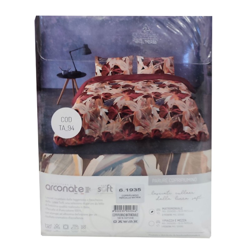 Parure copripiumino matrimoniale percalle 100% cotone disegno TA94 da Tessitura di Arconate, stampa digitale alta definizione. Composto dal sacco copripiumino e due federe cuscino. Prodotto di alta qualità made in Italy.