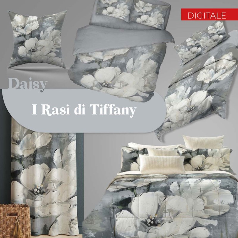 Set letto arredo I rasi di Tiffany Daisy da SGhome, ottima azienda di biancheria per la casa. Tessuto microfibra stampata o cotone in digitale, misura letto matrimoniale / due piazze, trapunta, lenzuolo copriletto, pannello tenda e coppia federe arredo.