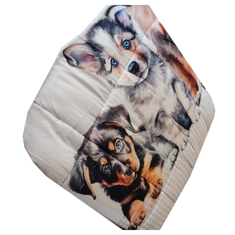 Trapunta invernale disegno Cani batuffoli da Daunex, azienda di biancheria per la casa. Stampa digitale, interno e esterno in microfibra anallergica, per letto matrimoniale, ottima qualità.