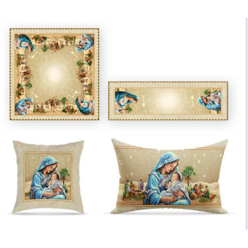 Centro tavola, runner e fodera arredo e cuscino rettangolare imbottito Gobelin disegno Natale Nazaret da Vingi, ottima azienda di biancheria per la casa made in Italy. Tessuto 60% cotone 40% poliestere, prodotto molto bello e esclusivo con un ottimo rapporto qualità prezzo.