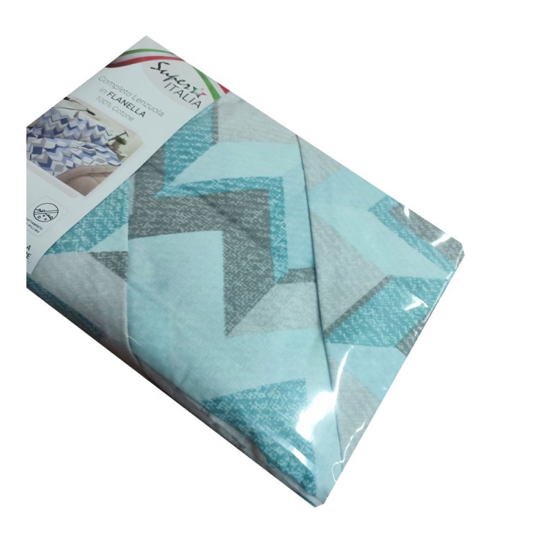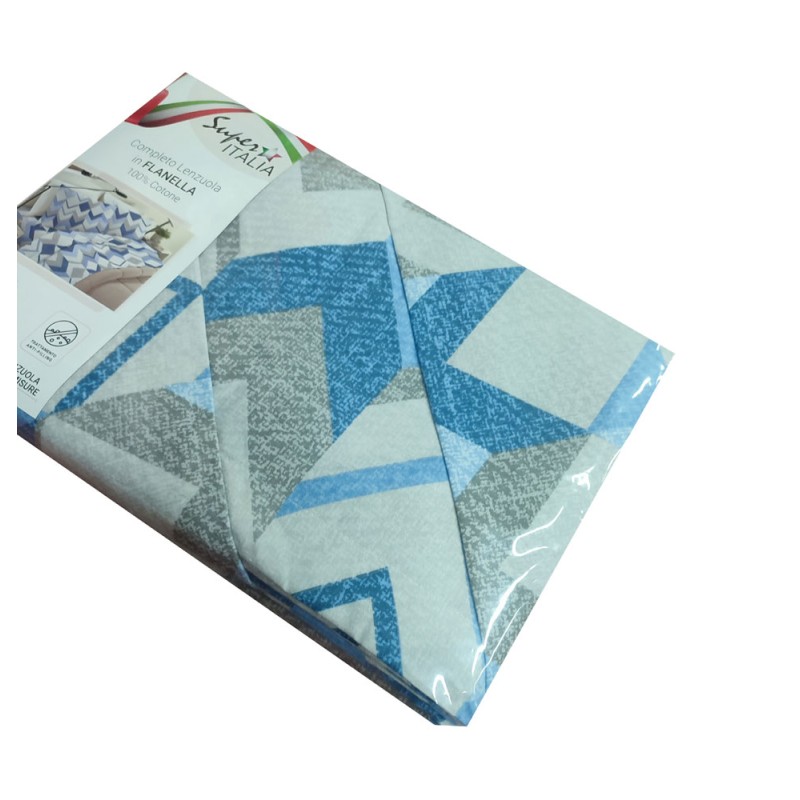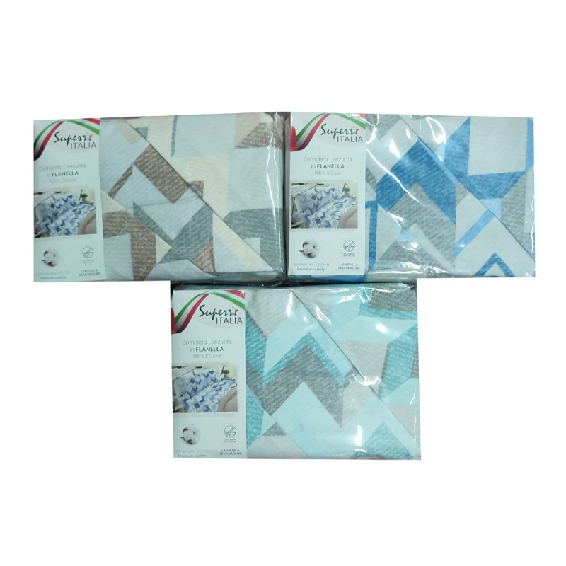 Completo lenzuola 100% flanella cotone disegno Zigzag Super Italia. Disponibile nella misura letto matrimoniale / due piazze, trattamento anti-pilling, bel prodotto made in Italy con un ottimo rapporto qualità prezzo.