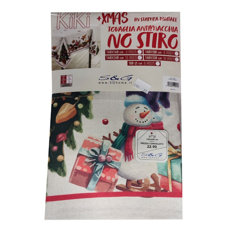 Tovaglia antimacchia disegno Kiki Xmas Pupazzo da Sghome, ottima azienda di biancheria per la casa. Tessuto 100% poliestere effetto lino, si pulisce facilmente con una spugnetta, stampe digitali molto belle, misure disponibili da 6 e 12, un prodotto vincente a un ottimo prezzo di vendita.
