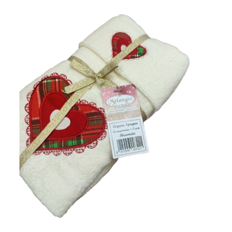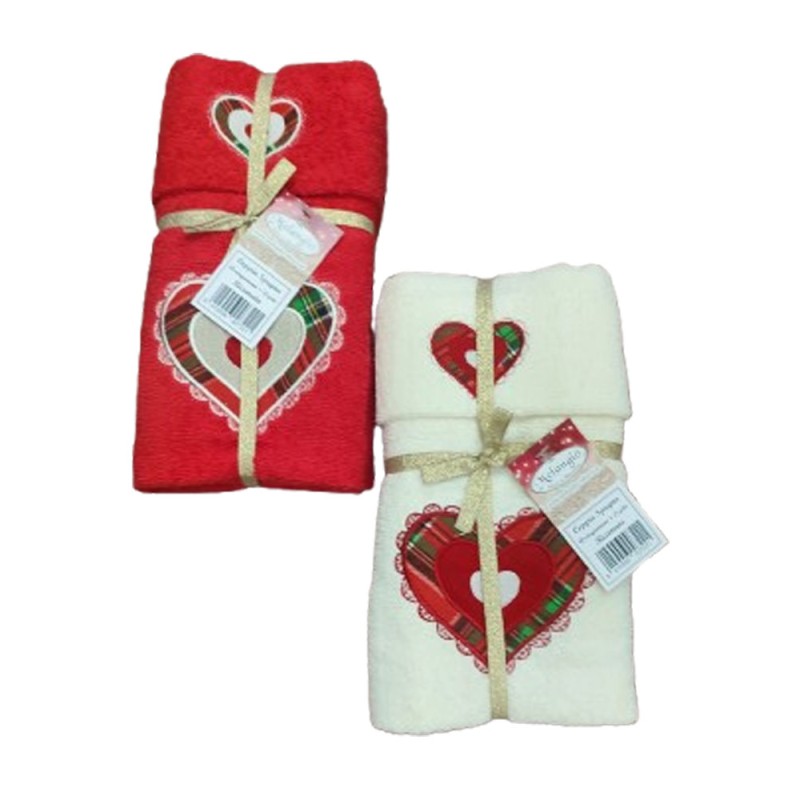 COPPIA SPUGNA ASCIUGAMANO + OSPITE RICAMATO NATALE CUORE TARTAN MELANGIO