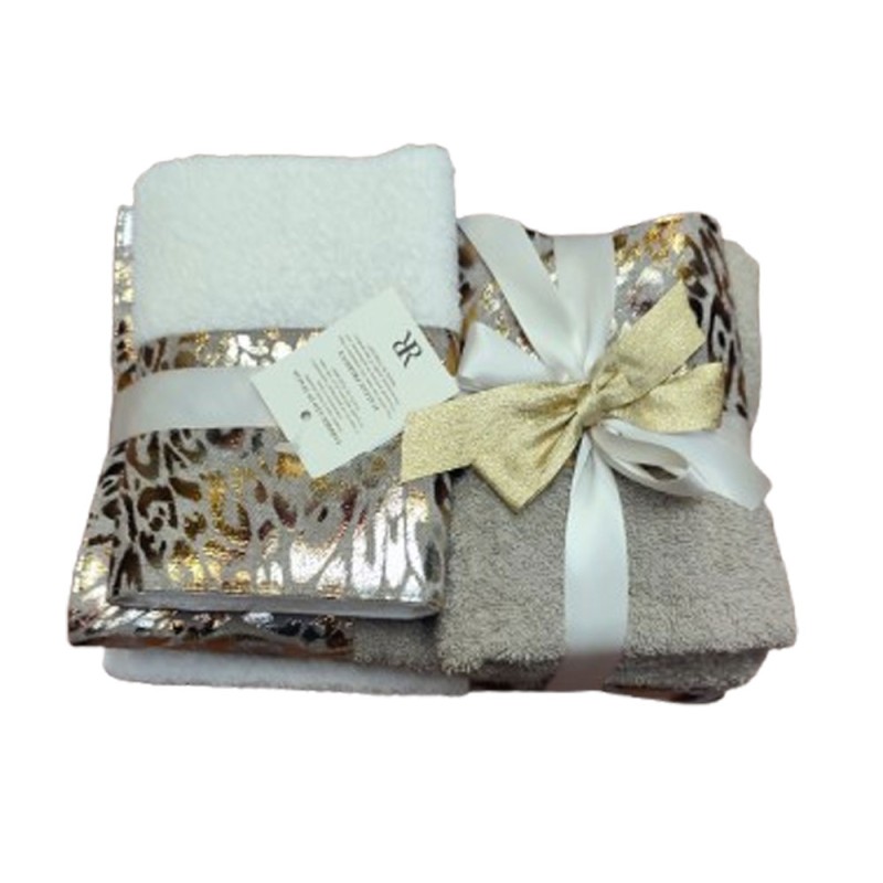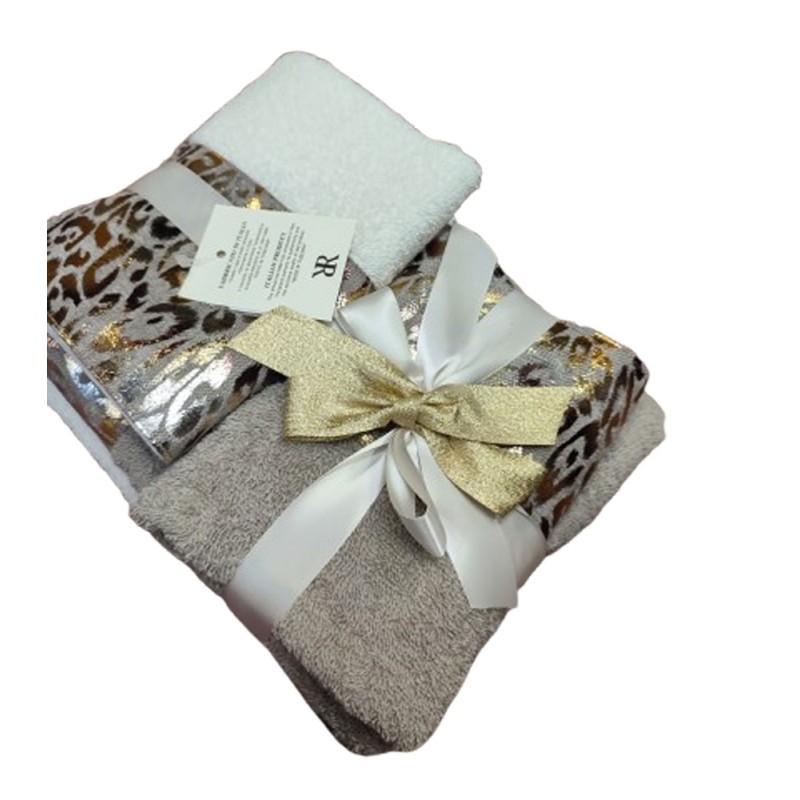 Doppia coppia spugna asciugamano + ospite Maculato lurex da RR, ottima azienda di biancheria per la casa made in Italy. Spugna morbidissima 100% cotone, balza con stampa, bellissimo prodotto di qualità e eleganza.