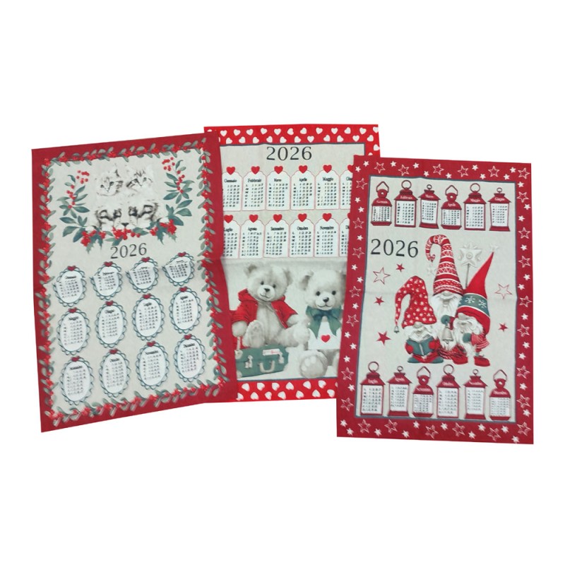 Strofinacci calendario 100% cotone Speciale Natale disegno Cuori orsetto gnomo da Pezzoli, ottima azienda di biancheria per la casa made in Italy. Confezione da 6 pezzi, 2x disegni, un bel prodotto con un ottimo rapporto qualità prezzo. Lavabile in lavatrice a 40°.