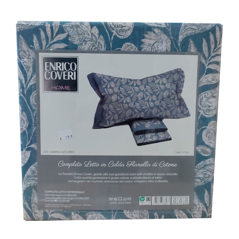 Completo lenzuola 100% flanella di cotone Sabina azzurro da Enrico Coveri, ottima azienda di biancheria per la casa. Disponibile nella misura letto matrimoniale / due piazze.