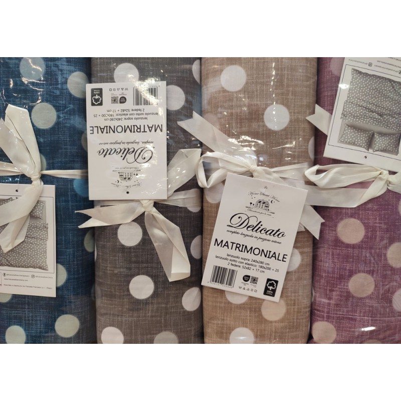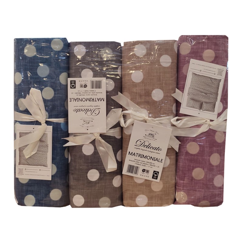Completo lenzuola 100% cotone disegno Delicato Bolle da Home sweet home. Ottimo rapporto qualità prezzo, confezione da 4 completi assortiti nei colori. Disponibile solo nella misura letto matrimoniale / due piazze.