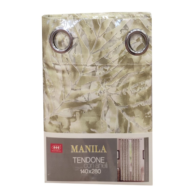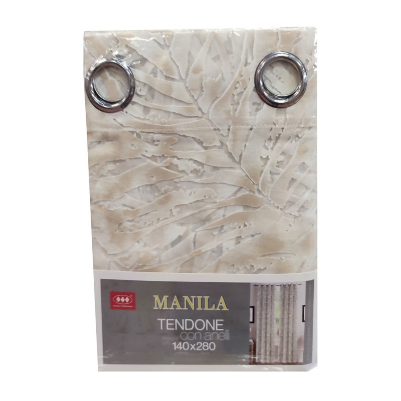 Tendone 140x280cm Manila da Gitiesse, ottima azienda molto dinamica di biancheria per la casa. Confezione da 1 pezzo, anelli metallici e 2 colori disponibili. Tessuto in poliestere stampato semicoprente con lavorazione in trasparenza, molto bello, elegante e ricercato.