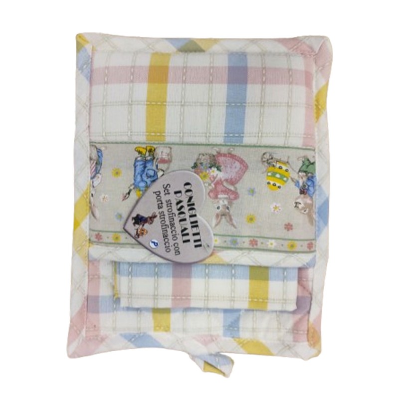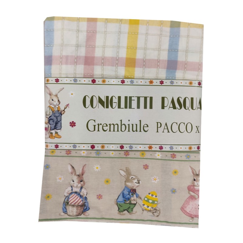 Set cucina disegno Coniglietti pasquali da Pezzoli, ottima azienda di biancheria per la casa. 100% cotone tinto in filo con bordo stampato. Comprende varie tipologie di prodotti per potere proporre una linea completa molto bella per la cucina con ottimi prezzi di vendita.