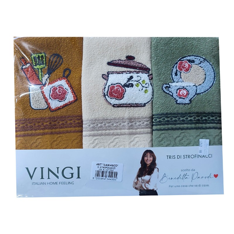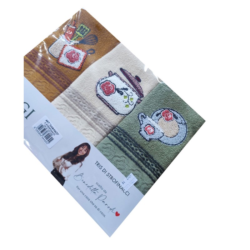 Strofinacci set 3 pezzi disegno Damasco Portazucchero da Vingi, ottima azienda di biancheria per la casa. Disegni ricamati, tessuto 100% cotone spugna, bel prodotto con un ottimo rapporto qualità prezzo. Lavabile in lavatrice a 40°.