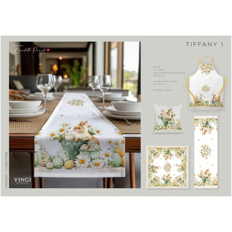 Set tovaglia, centro tavola, runner, grembiule e fodera cuscino disegno Tiffany 1 Pasqua da Vingi, ottima azienda di biancheria per la casa made in Italy. Tessuto 100% cotone con stampa digitale, prodotto molto bello e esclusivo con un ottimo rapporto qualità prezzo.
