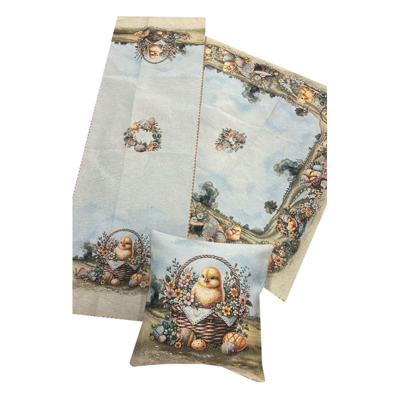 Speciale Pasqua, set con centro, runner e fodera arredo e cuscino rettangolare imbottito, tessuto Gobelin molto esclusivo e ricercato, Made in Italy, ottimo qualità da Vingi
