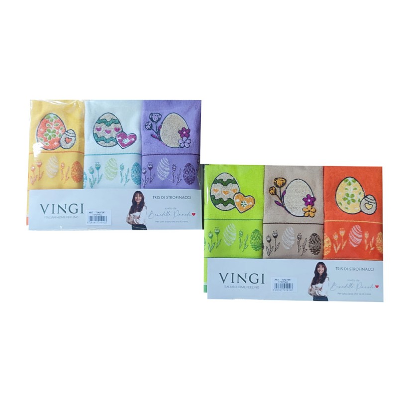 Speciale Pasqua, 2 varianti colori, confezione da 3 pezzi, 55 x 80 cm, tessuto ricamato 100% cotone spugna, ottimo prodotto Made in Italy da Vingi