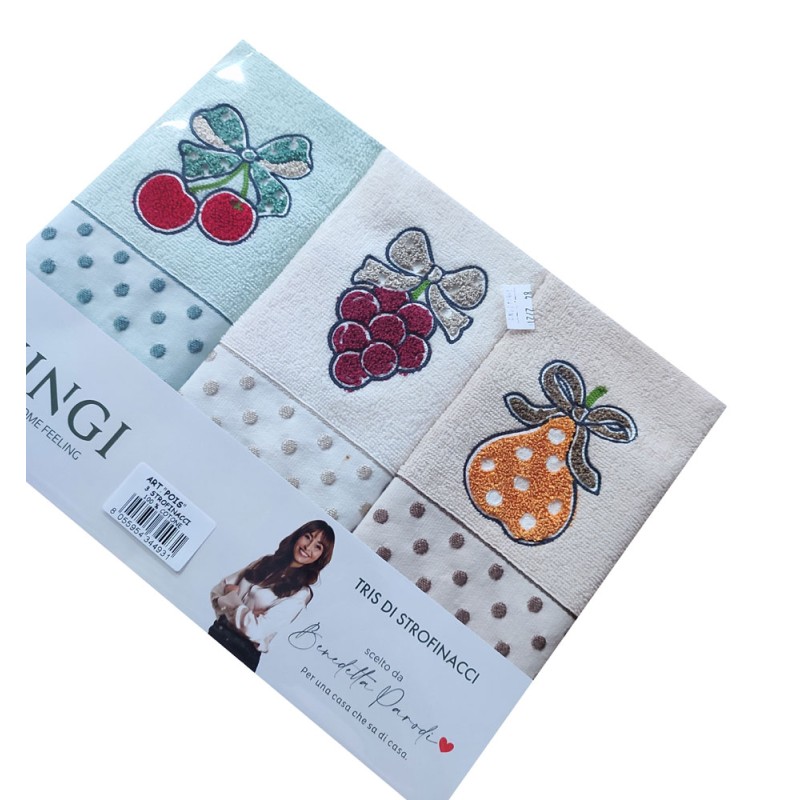 Strofinacci set 3 pezzi disegno Pois Uva da Vingi, ottima azienda di biancheria per la casa. Disegni ricamati, tessuto 100% cotone spugna, bel prodotto con un ottimo rapporto qualità prezzo. Lavabile in lavatrice a 40°.