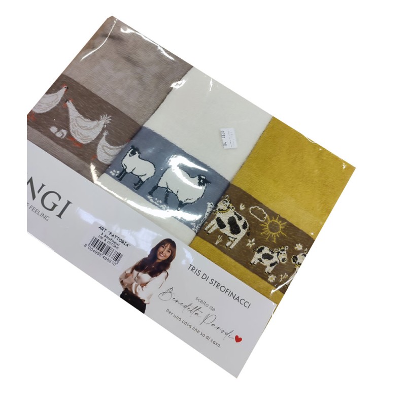 Strofinacci set 3 pezzi disegno Fattoria Mucche da Vingi, ottima azienda di biancheria per la casa. Disegni con lavorazione jacquard, 100% cotone spugna, bel prodotto con un ottimo rapporto qualità prezzo. Lavabile in lavatrice a 40°.