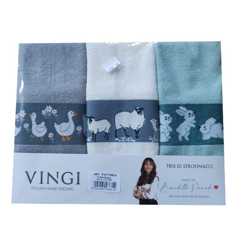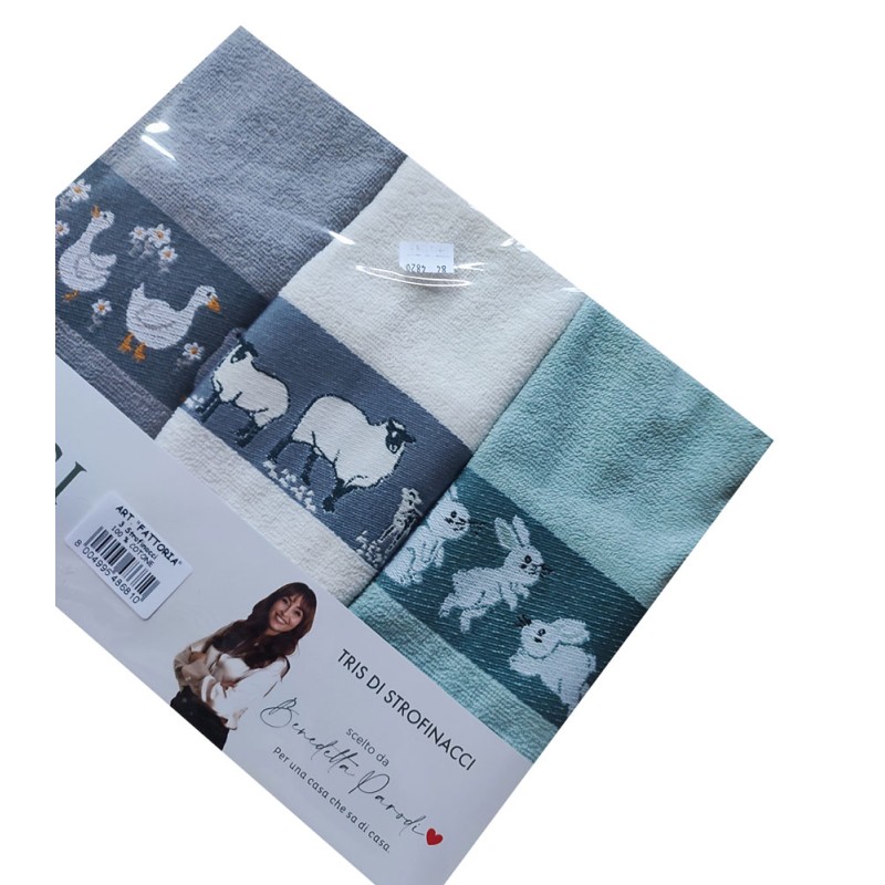 Strofinacci set 3 pezzi disegno Fattoria Pecore da Vingi, ottima azienda di biancheria per la casa. Disegni con lavorazione jacquard, 100% cotone spugna, bel prodotto con un ottimo rapporto qualità prezzo. Lavabile in lavatrice a 40°.