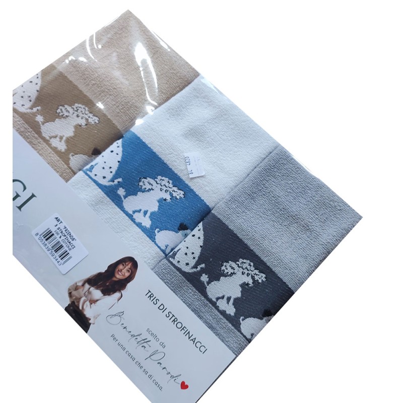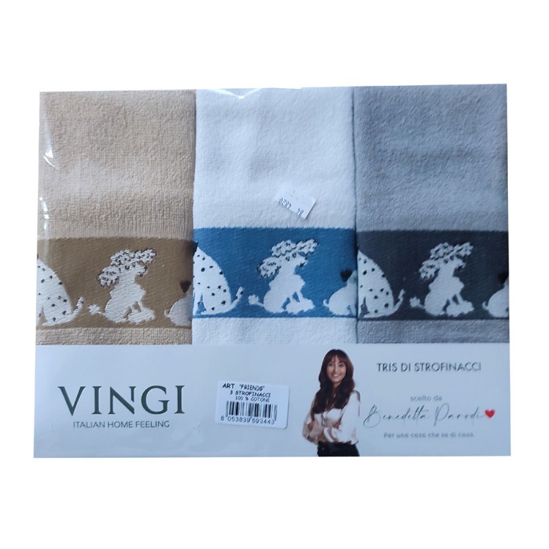 Strofinacci set 3 pezzi disegno Friends Cani da Vingi, ottima azienda di biancheria per la casa. Disegni con lavorazione jacquard, 100% cotone spugna, bel prodotto con un ottimo rapporto qualità prezzo. Lavabile in lavatrice a 40°.