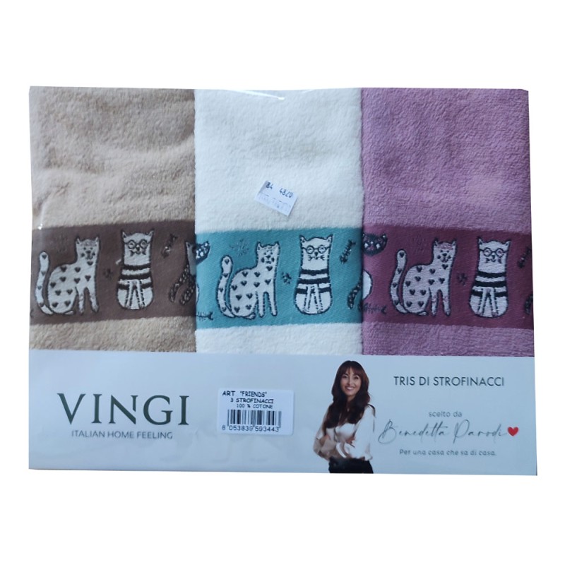Strofinacci set 3 pezzi disegno Friends Gatti da Vingi, ottima azienda di biancheria per la casa. Disegni con lavorazione jacquard, 100% cotone spugna, bel prodotto con un ottimo rapporto qualità prezzo. Lavabile in lavatrice a 40°.
