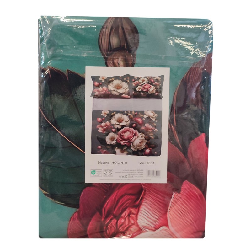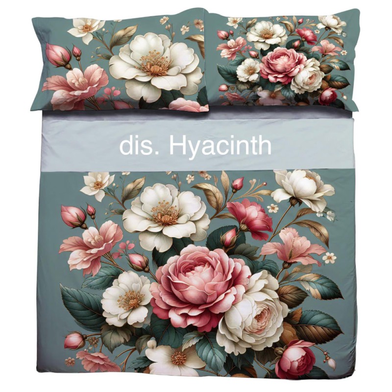 Lenzuolo copriletto disegno Hyachint Linea Sandy da Novia, ottima azienda di biancheria per la casa. 100% cotone, stampe digitali a alta risoluzione, composto dal lenzuolo sopra, lenzuolo sotto con angoli e due federe cuscino. La stampa è anche sulla balza del lenzuolo sopra in modo da poterlo usare come copriletto nei mesi estivi più caldi.