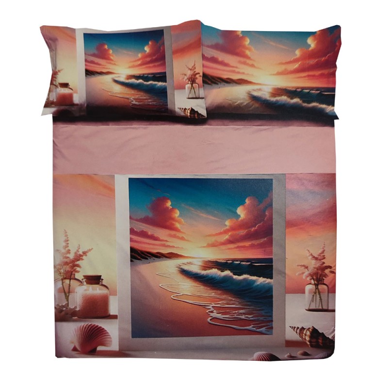 Lenzuolo copriletto 100% cotone stampe digitali anche nella balza, con lenzuolo sotto e due federe, bellissimo prodotto linea Sandy Novia