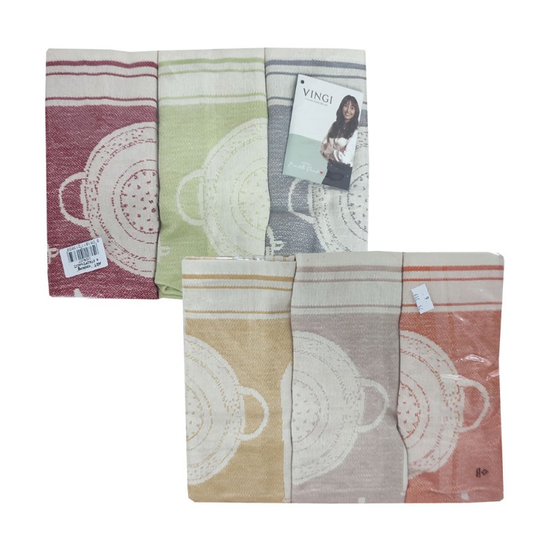 Strofinacci set 6 pezzi disegno Cooking da Vingi, ottima azienda di biancheria per la casa. Tessuto 100% cotone, lavorazione jacquard, 6 colori 1x, bel prodotto di qualità Made in Italy.