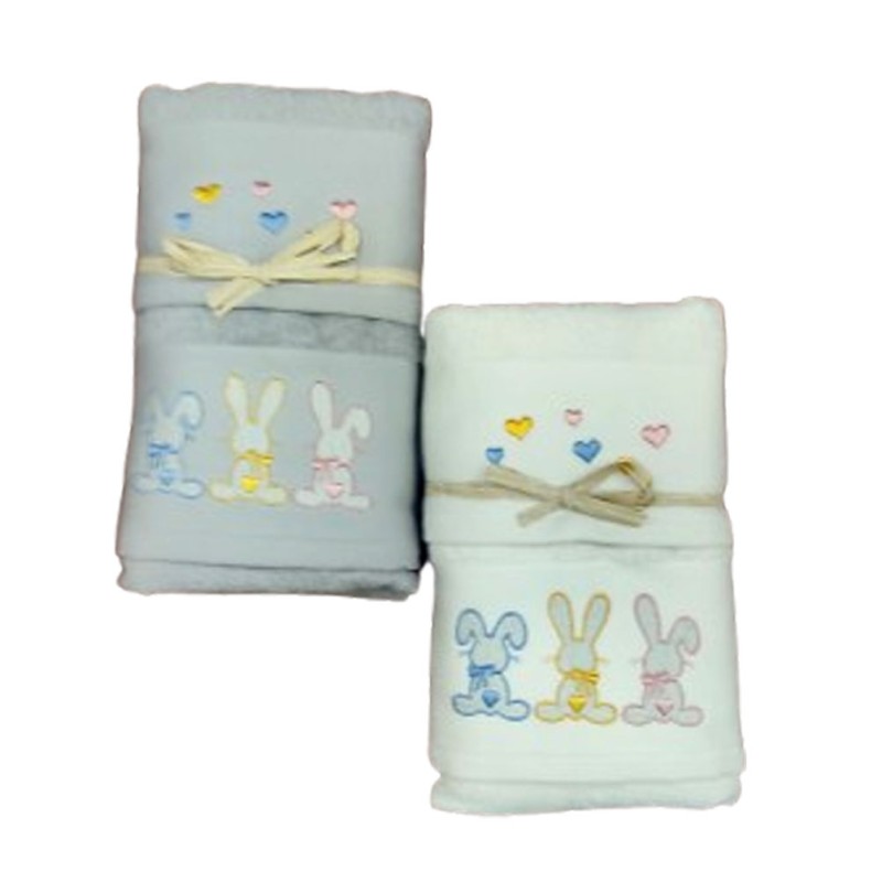 SET SPUGNA RICAMATO ASCIUGAMANO + OSPITE PASQUA CONIGLI CUORI MULTICOLOR PEZZOLI
