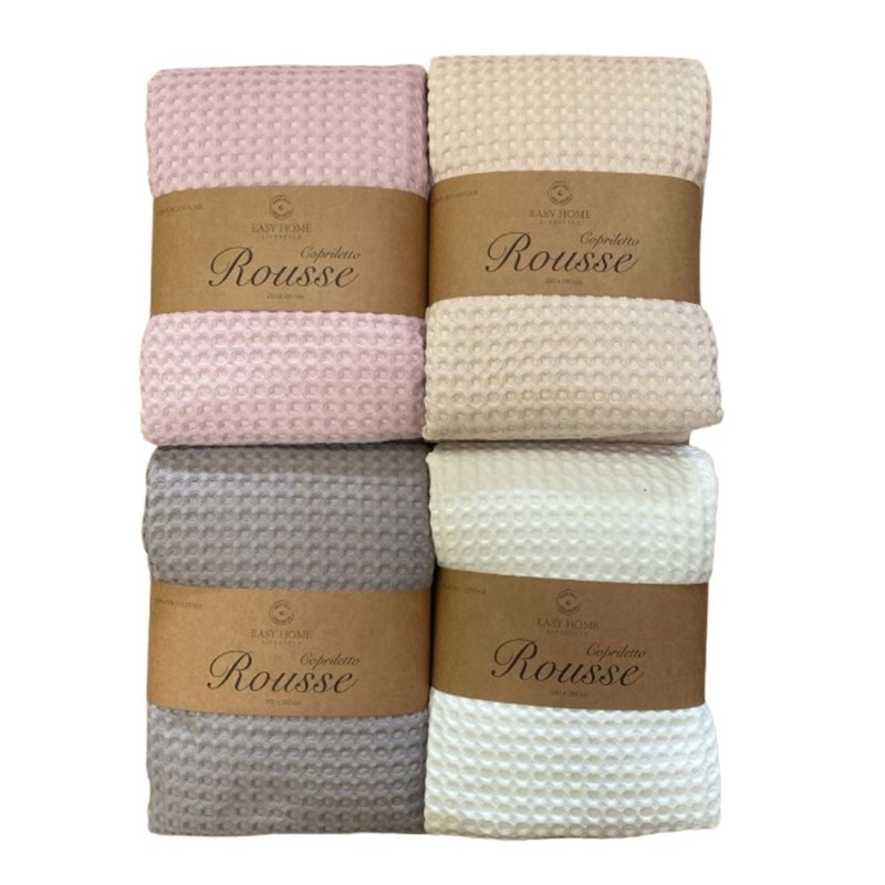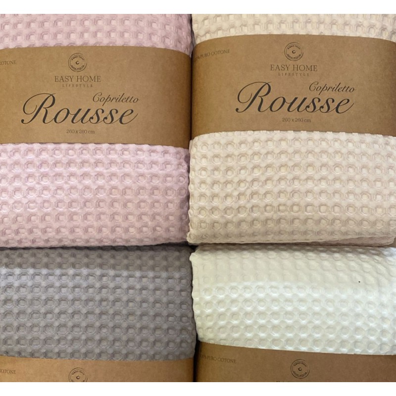 Copriletto 100% cotone Rousse da Easy home, ottima azienda di biancheria per la casa. 4 colori, bellissimo effetto lavorazione tipo nido d'ape. Disponibile nelle misure letto matrimoniale / due piazze.