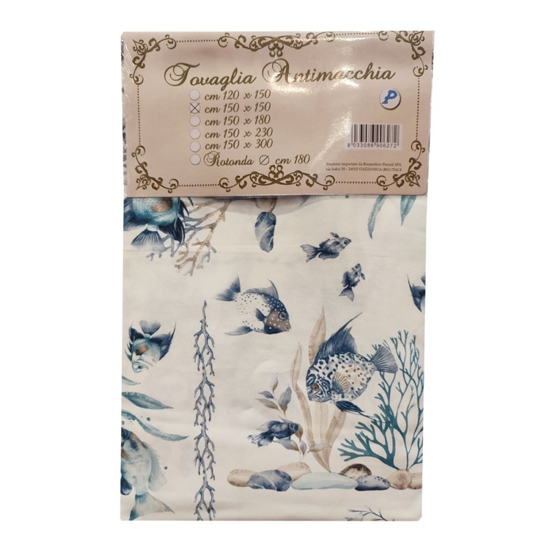 Tovaglia antimacchia disegno Acquario da Pezzoli, ottima azienda di biancheria per la casa. Tessuto 100% poliestere, si pulisce facilmente con una spugnetta, stampe molto belle, varie misure disponibili, un prodotto vincente a un ottimo prezzo di vendita.