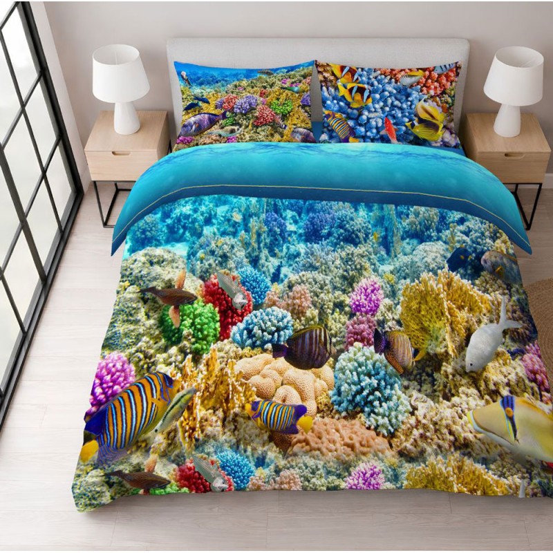 Lenzuola copriletto disegno Reef da Quadrifoglio-Gipetex, ottima azienda di biancheria per la casa Made in Italy. 100% cotone, stampe digitali a alta risoluzione, composto dal lenzuolo e due federe cuscino. La stampa è anche sulla balza del lenzuolo abbinata alle federe in modo da poterlo usare come copriletto nei mesi estivi più caldi.