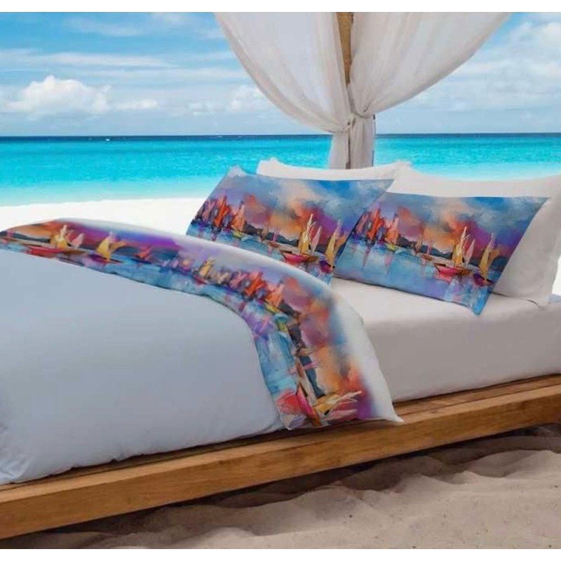 Completo lenzuola 100% cotone disegno Holiday 52 da Manifattura Imberti, ottima azienda di biancheria per la casa Made in Italy. Stampe digitali a alta risoluzione anche sul lenzuolo sopra cordonetto, un prodotto di alta qualità. Disponibile nella misura letto matrimoniale / due piazze.