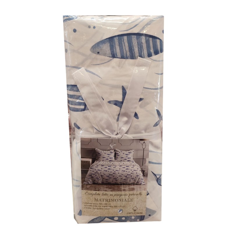 Completo lenzuola matrimoniale percalle 100% cotone Pesci blu da Pezzoli, made in Italy. Bellissime stampe e ottimo rapporto qualità prezzo.