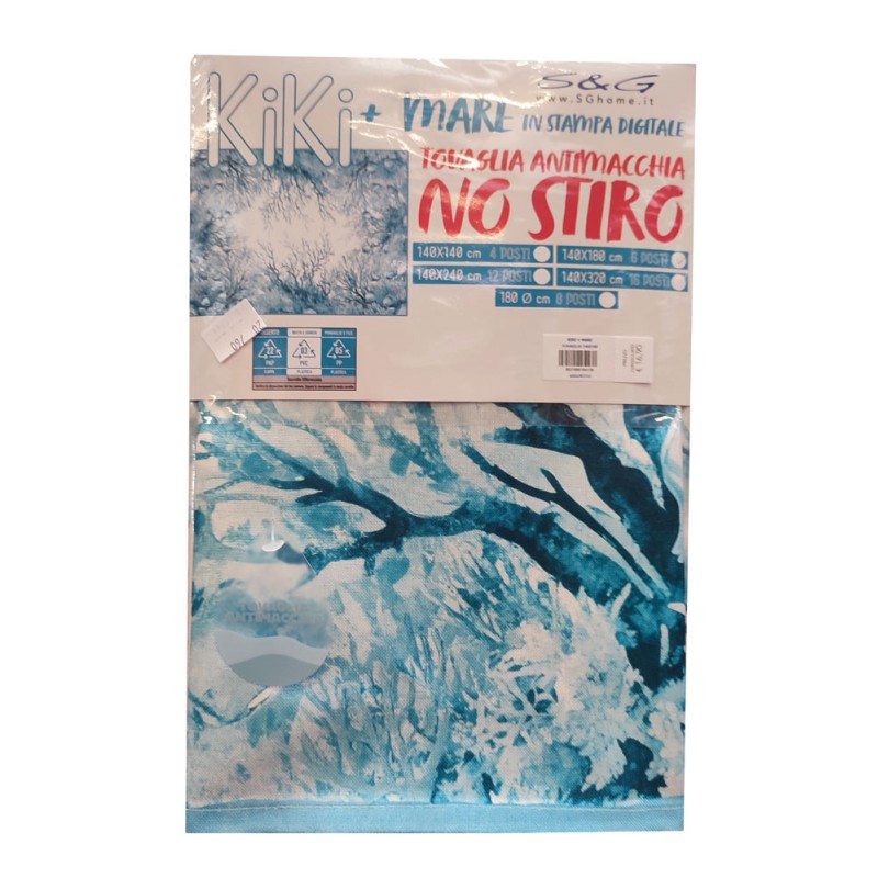 Tovaglia antimacchia disegno Kiki Mare coralli azzurro da Sghome, ottima azienda di biancheria per la casa. Tessuto 100% poliestere effetto lino, si pulisce facilmente con una spugnetta, stampe digitali molto belle, misure disponibili da 6 e 12, un prodotto vincente a un ottimo prezzo di vendita.