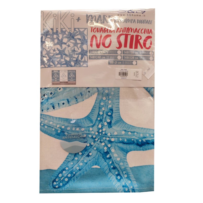 Tovaglia antimacchia disegno Kiki Mare stelle marine da Sghome, ottima azienda di biancheria per la casa. Tessuto 100% poliestere effetto lino, si pulisce facilmente con una spugnetta, stampe digitali molto belle, misure disponibili da 6 e 12, un prodotto vincente a un ottimo prezzo di vendita.