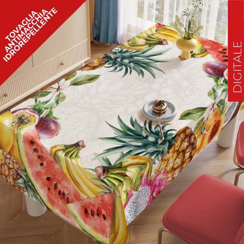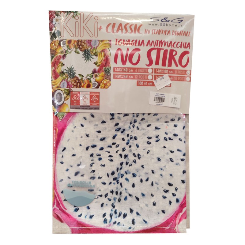 Tovaglia antimacchia disegno Kiki Classic frutta da Sghome, ottima azienda di biancheria per la casa. Tessuto 100% poliestere effetto lino, si pulisce facilmente con una spugnetta, stampe digitali molto belle, misure disponibili da 6 e 12, un prodotto vincente a un ottimo prezzo di vendita.