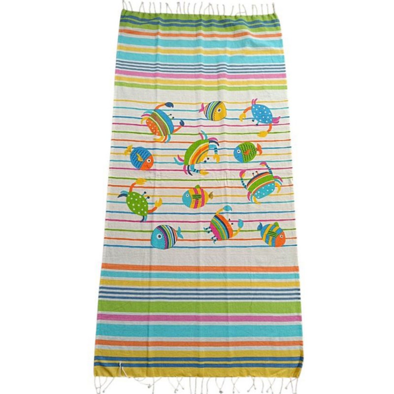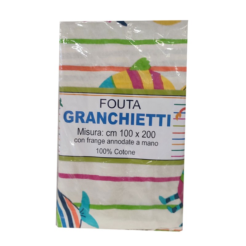 Telo mare pareo disegno Granchietti da Pezzoli, ottima azienda di biancheria per la casa. Misura 100 x 200 cm, 100% cotone fouta con frange annodate a mano. La Fouta è fabbricata ancora oggi artigianalmente attraverso l'accurato metodo di tessitura tradizionale. Bel prodotto di importazione con un ottimo rapporto qualità prezzo.