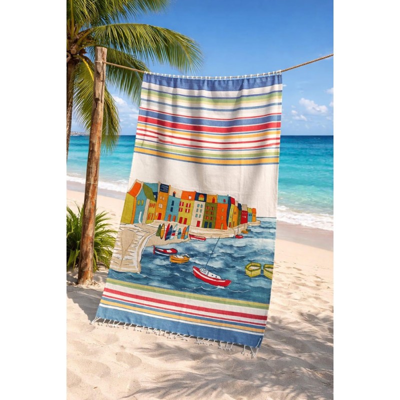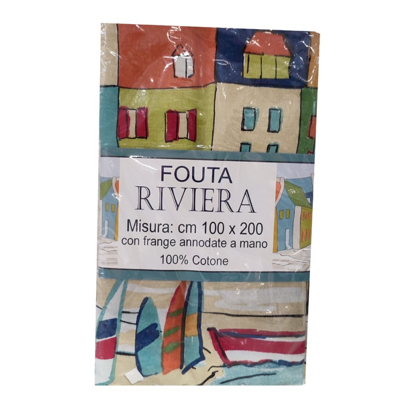 Telo mare pareo disegno Riviera da Pezzoli, ottima azienda di biancheria per la casa. Misura 100 x 200 cm, 100% cotone fouta con frange annodate a mano. La Fouta è fabbricata ancora oggi artigianalmente attraverso l'accurato metodo di tessitura tradizionale. Bel prodotto di importazione con un ottimo rapporto qualità prezzo.