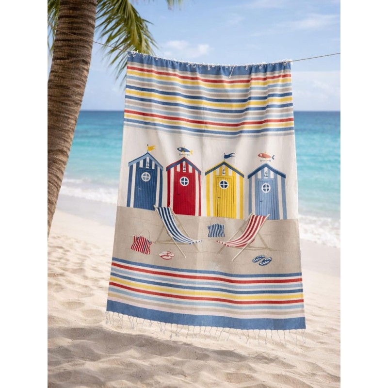 Telo mare pareo disegno Cabine da Pezzoli, ottima azienda di biancheria per la casa. Misura 100 x 200 cm, 100% cotone fouta con frange annodate a mano. La Fouta è fabbricata ancora oggi artigianalmente attraverso l'accurato metodo di tessitura tradizionale. Bel prodotto di importazione con un ottimo rapporto qualità prezzo.