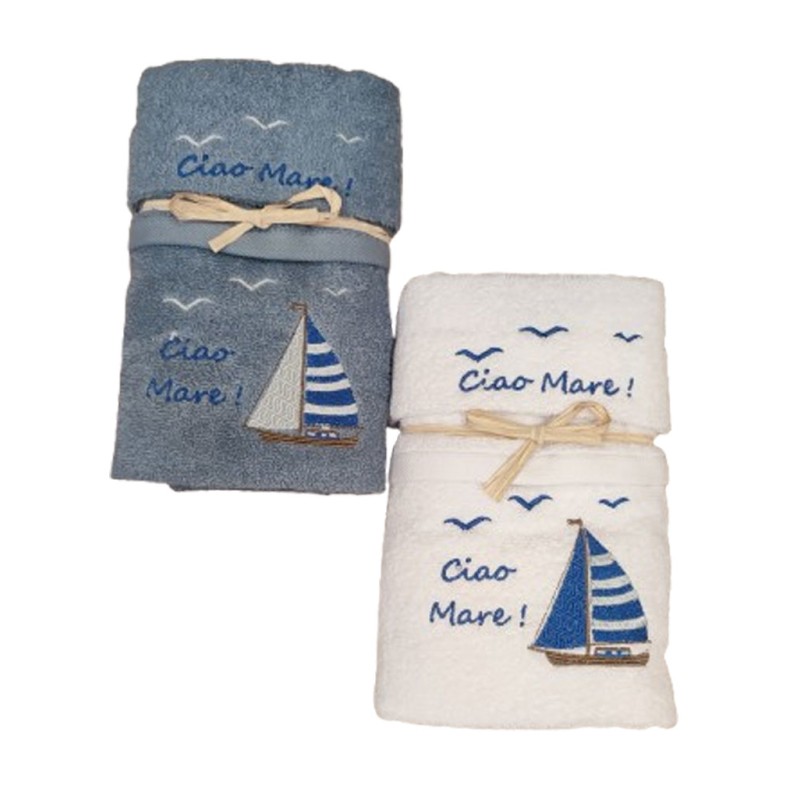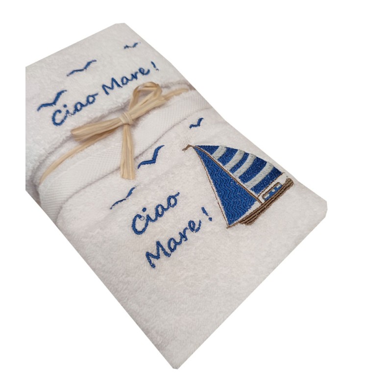 Set spugna ricamato asciugamano + ospite Ciao mare da Pezzoli, ottima qualità made in Turchia.
