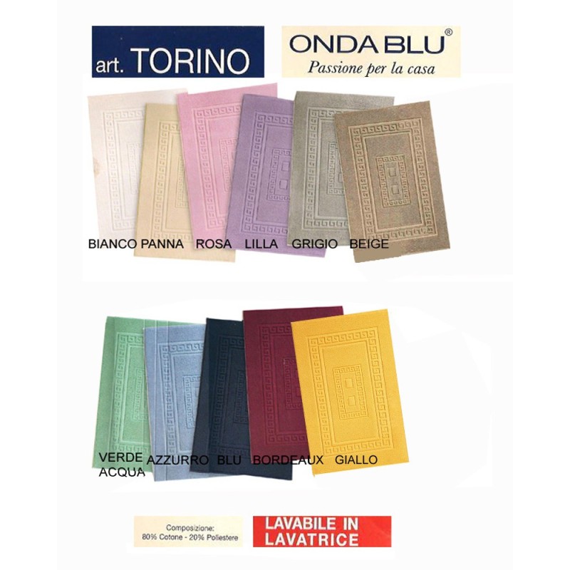 tappeto bagno modello Torino da Onda blu, ottima azienda italiana nella produzione di biancheria per la casa. La confezione comprende un pezzo tappeto 60x120cm. Tessuto spugna jacquard morbida e molto assorbente, bella lavorazione a cornice, sottofondo antiscivolo, lavabile in lavatrice, vari colori disponibili, un eccellente rapporto qualità prezzo.