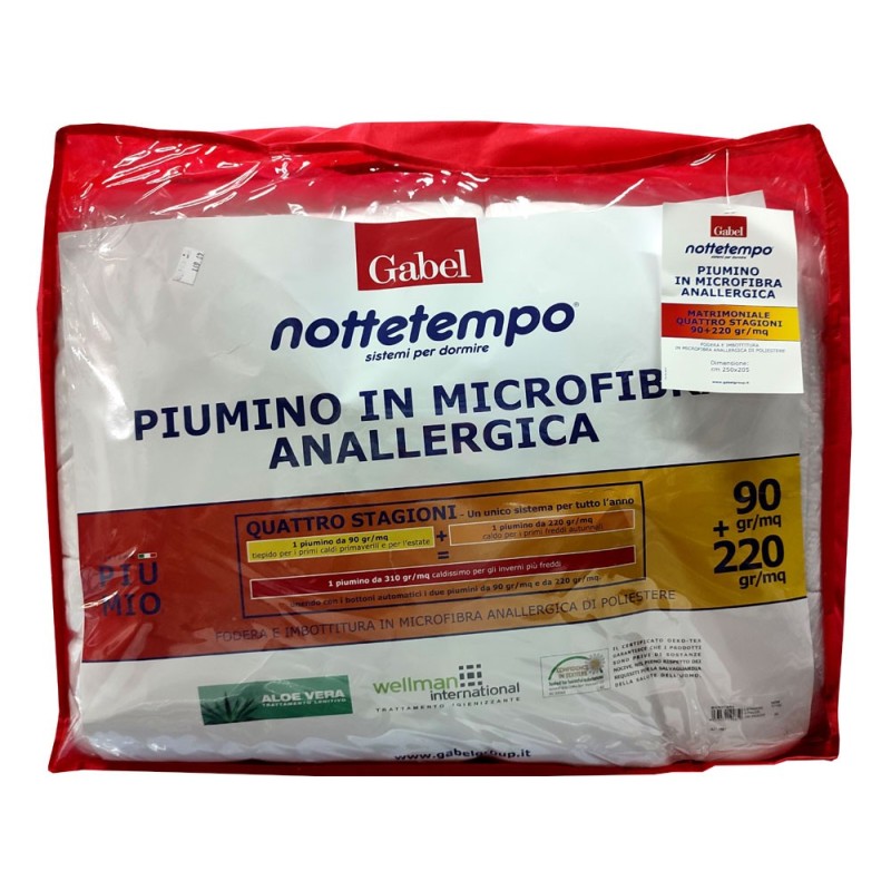 Piumino 4 Stagioni microfibra Nottetempo da Gabel. Nelle misure letto matrimoniale, una piazza e mezza e singolo. Imbottitura in microfibra anallergica. Confezione composta da 2 piumini, uno 90 gr/mq e l'altro più pesante da 220 gr/mq.