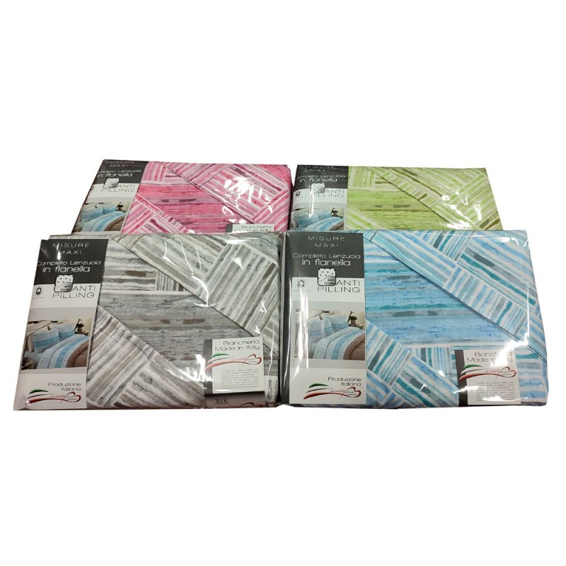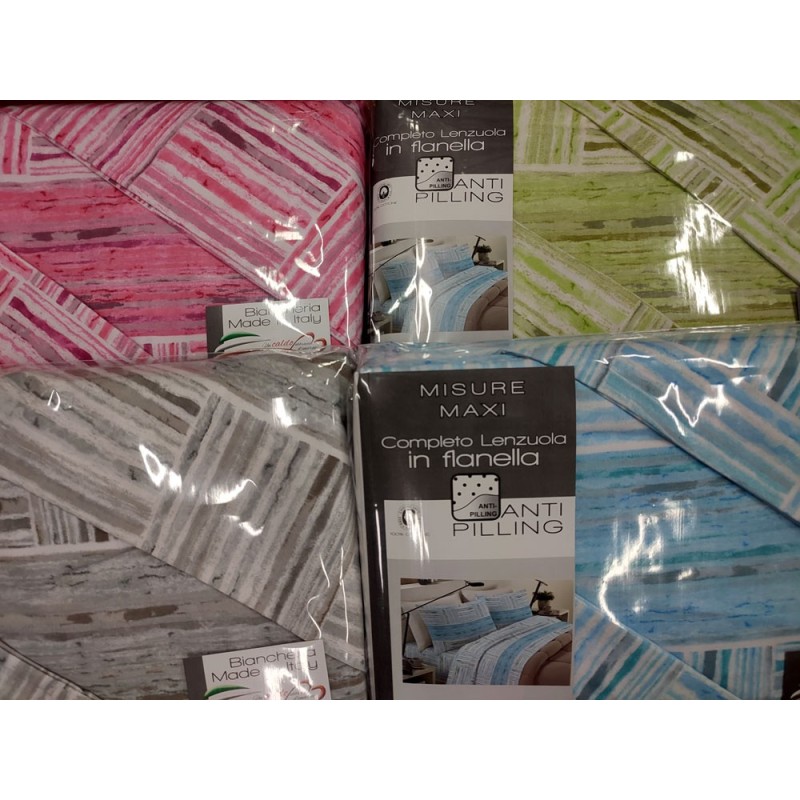 Completo lenzuola 100% flanella cotone disegno Righe Marinoni. Disponibile nella misura letto matrimoniale / due piazze, trattamento anti-pilling, bel prodotto made in Italy con un ottimo rapporto qualità prezzo.