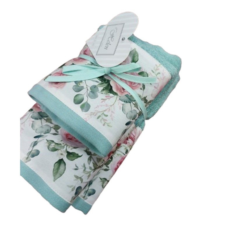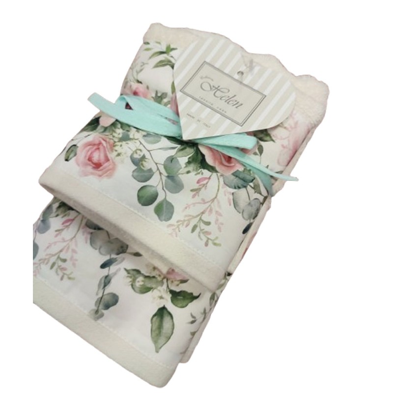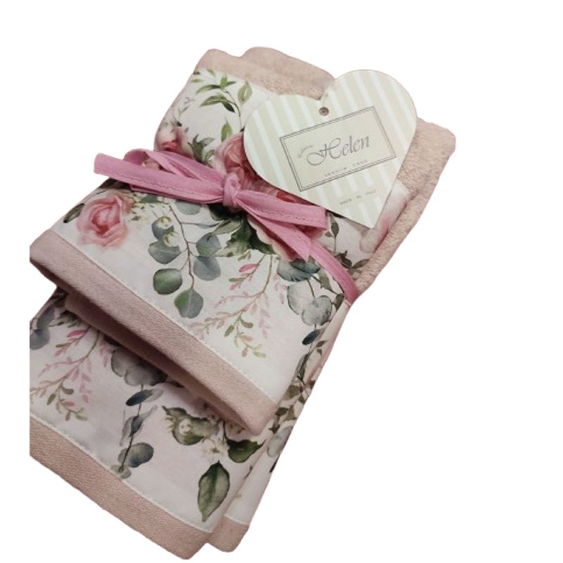 Coppia spugna asciugamano + ospite New Flower da Helen, ottima azienda di biancheria per la casa made in Italy. Spugna morbidissima 100% cotone, stampe digitale nella balza, bellissimo prodotto di qualità e eleganza.