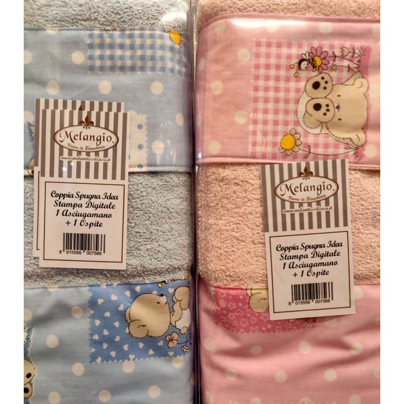 Coppia spugna asciugamano + ospite Idea Orsetti da Melangio, ottima azienda di biancheria per la casa made in Italy. Spugna morbidissima 100% cotone, stampe digitale nella balza, bellissimo prodotto di qualità e eleganza.