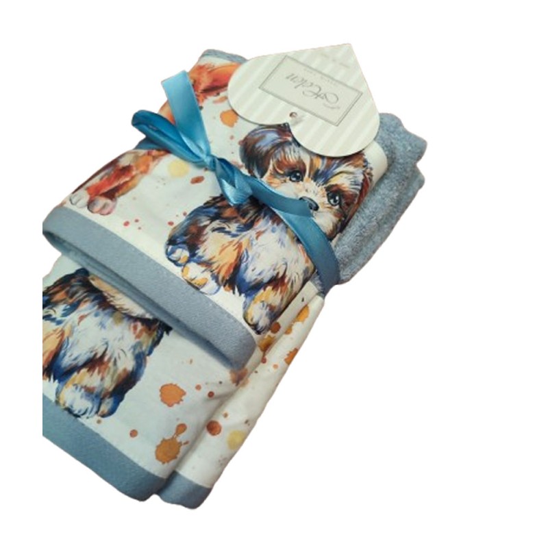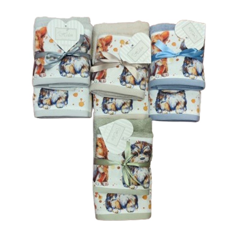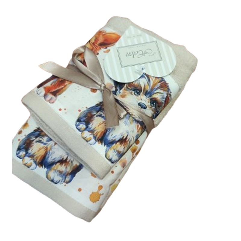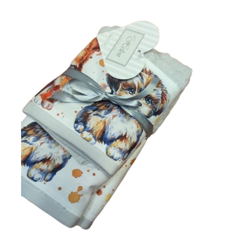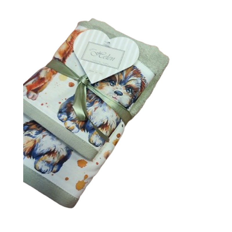 Coppia spugna asciugamano + ospite Dog da Helen, ottima azienda di biancheria per la casa made in Italy. Spugna morbidissima 100% cotone, stampe digitale nella balza, bellissimo prodotto di qualità e eleganza.